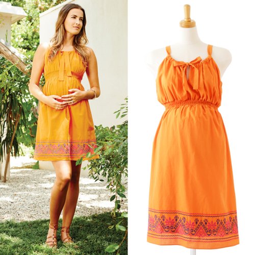 発色のきれいなサマーオレンジのサンドレスはリゾートシーンからデイリーまで、ママの夏のおしゃれを盛り上げてくれそうな1着。スカートのすそ部分にはフォークロア調の繊細な刺しゅう入り。ハイウエストマークなのでおなか周りをすっきりと見せてくれ、ふんわり広がるスカートラインもきれいです。デコルテを美しく見せるえりの開き具合もちょうど良く、フロントで結ぶリボンもポイントに。妊娠中はもちろん、産後も着ていただけます。