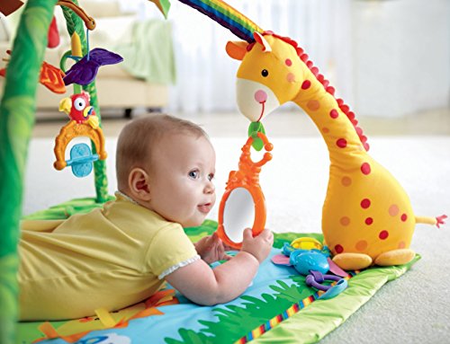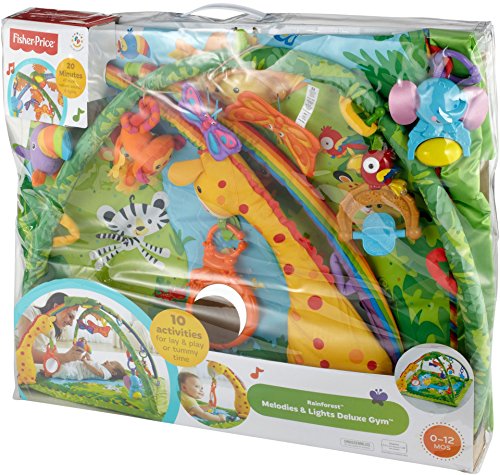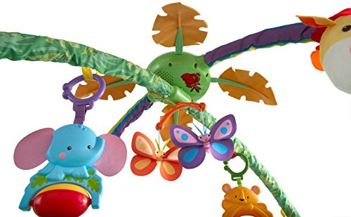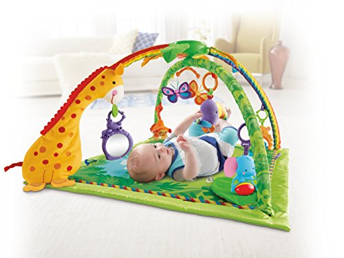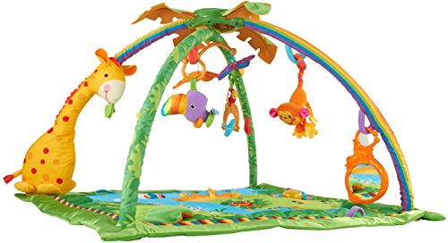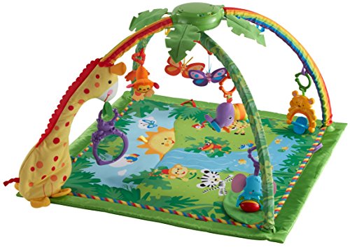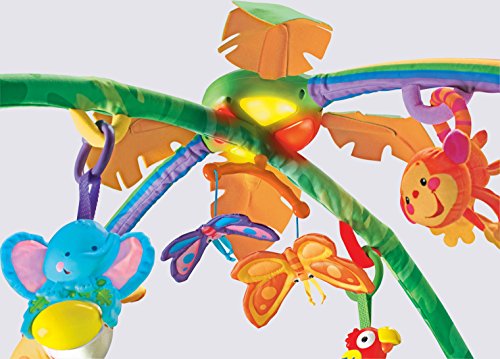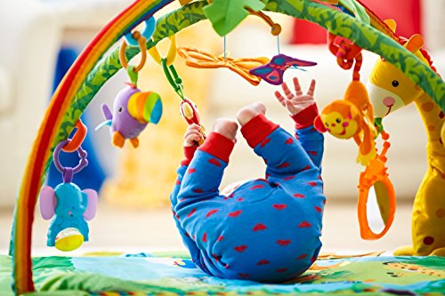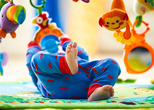 やわらかな光がふりそそぎ、楽しい大自然のサウンドや20分間もの音楽を楽しめるキルトのジムです。音楽に合わせて、ライトがゆっくりと点滅します。赤ちゃんをつつみこむ大きな虹のアーチから、レインフォレストのどうぶつたちがこんにちは!赤ちゃんが触ったりひっぱるたびに、いろいろな仕掛けで応えます。赤ちゃんの動きに反応するモードと20分間の自動演奏モードで、お遊びタイムとおねんねタイムの切り替えができます。どうぶつたちは取りはずしができて、マットにつければ、はいはいでも楽しく遊べます!