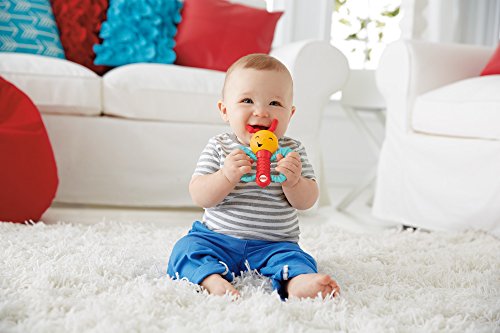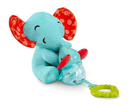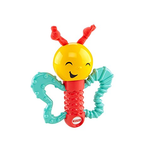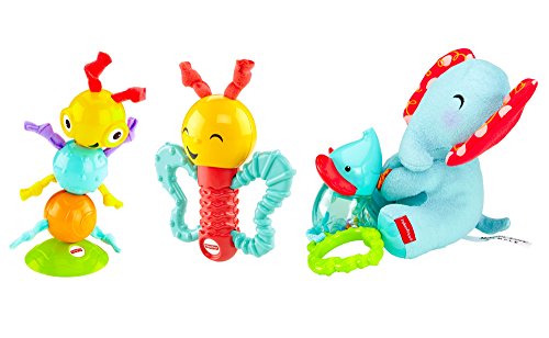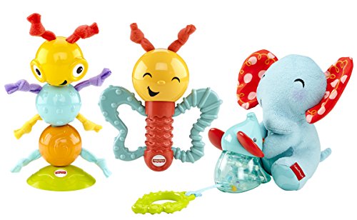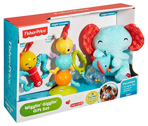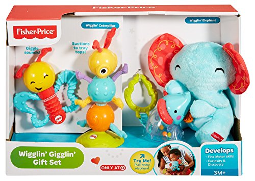 It's hard to tell who will be wigglin' and gigglin' more - the adorable animal characters in this gift set or your baby! Pull the baby elephant rattle that's attached to the plush mummy elephant - and watch the fun wiggle action.Or your little one can shake the smiley butterfly and be rewarded with lots and lots of giggles.The googly, textured caterpillar suctions to tray tops and entertains baby with his rattle sounds and wiggly, jiggly movements as little hands bat & reach.And there are lots of fun teethers.The baby elephant's ears and the butterfly's wings are chewy - and we've included a leaf teether, too.These activity toys are sure to put a big, wide (and mostly toothless) smile on baby's face!
