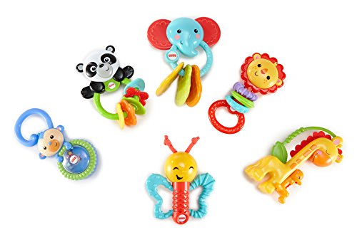 Gift set includes 6 adorable activity toys: Giraffe Slider, Panda Clackers, Lion Rattle, Giggling' Butterfly, Monkey Rattle and Elephant Tether; All toys are easy to grasp and sized just right for little hands to hold!; Perfect for at-home or on-the-go play!; Grasping and shaking the toys help give baby's motor skills a workout; The bright colors, fun sounds and textures help engage baby's senses of sight, hearing and touch
