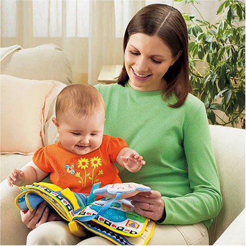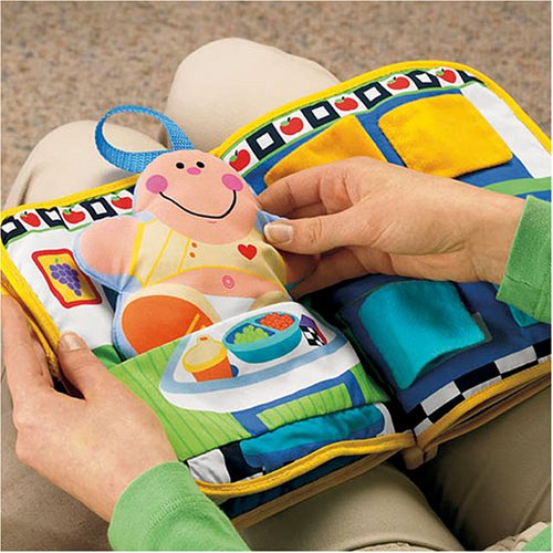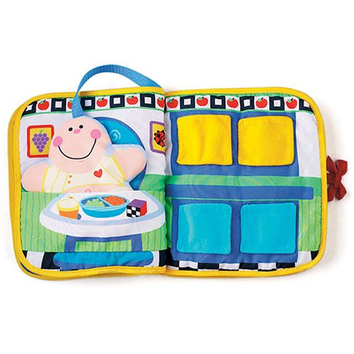 ベビーチェアー、おふろ、ベビーベッドなどが、人形の入るポケットになっていて、ごはんを食べたり、おふろに入ったり、赤ちゃんの一日を再現した布製絵本。自分と重ね合わせてイマジネーションが広がる。シーンに合わせてバスタオルやフエルトの扉、ワッフルの毛布などいろいろな手ざわりの布も登場し、めくる楽しさを演出! 押すと音楽が流れるボタン付き。 赤ちゃんの笑い声もする。人形にはビーズ入りで、ふると音が出る。収録曲は、「♪しあわせなら手をたたこう」「♪キラキラ星」の全2曲。オンオフスイッチ、音量調節機能付き。単四型アルカリ乾電池2本使用(テスト用電池付)、対象月齢、誕生から。