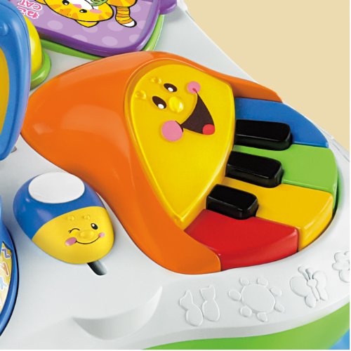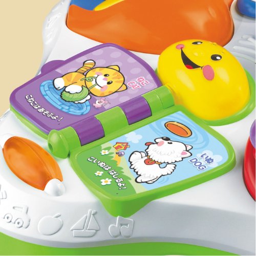 テーブルの上にパソコン、キーボード、絵本、電話が並んで、どこから手を伸ばしても楽しく遊べて、いろいろなことを学べるラーニングセンターです。4つのアイテムはそれぞれ個性的で、ピカピカ光って赤ちゃんを遊びに誘ってくれます。ボタンを押したり、ページをめくったりするたびにサウンドや音楽、ライトで応えて、文字や数字、かたち、反対語、あいさつなどさまざまなことを英語と日本語で教えてくれます。バイリンガルで、50以上の歌やおしゃべりを楽しめ、たくさんの仕掛けでたっぷり遊べます。テーブルの脚を外すと床に置いても遊べて、成長に合わせて長く使えます。