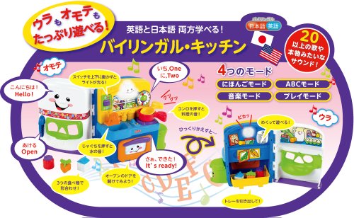 (1)にほんごモード、(2)ABCモード、(3)音楽モード、(4)プレイモード、という4つのモードから遊び方を選ぶことができます。数値や色、形、反対語などを、日本語や英語でおしゃべりします。音楽モードでは、歌もバイリンガルで遊べます。プレイモードでは本物のような効果音で遊ぶことができます。メロディと歌もたくさん内蔵し、ウラもオモテもたっぷり遊べる、楽しいキッチンです。