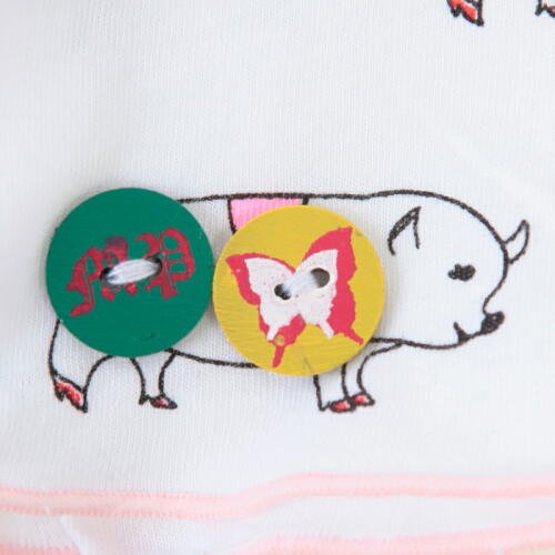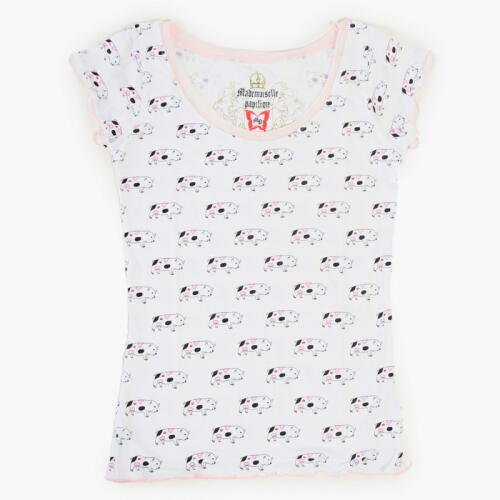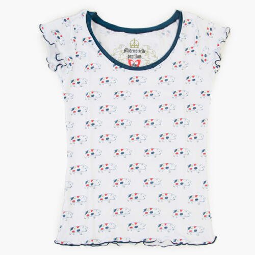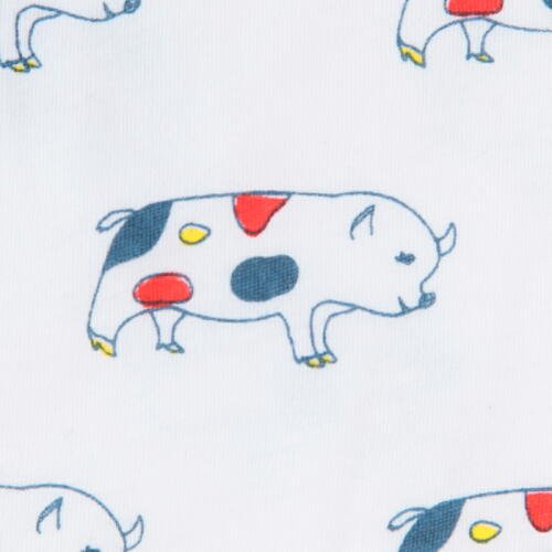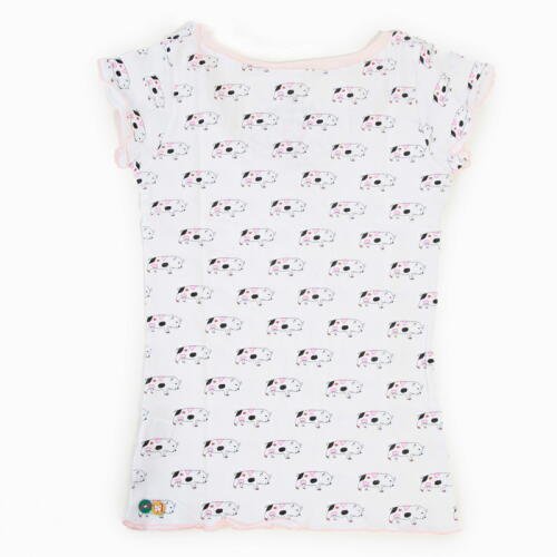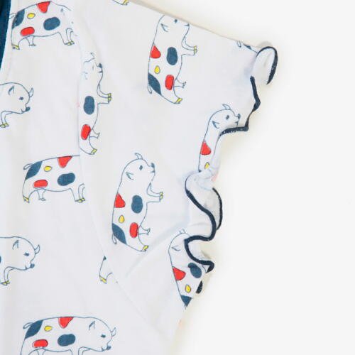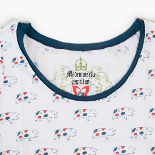 - 【商品のコメント1】マダラ模様のブタちゃんが可愛いTシャツ。着丈がやや長めのシルエットで、袖と裾部分がフリルカールしています。ブランドのネームタグはコットンで縫い付けてあります。