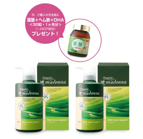 オーガニックマドンナ ボディセラムスーペリア450ml(妊娠線クリーム)・2個セット+葉酸サプリ30粒プレゼント!