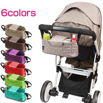 鍵やお財布、携帯電話など…お散歩やちょっとした近所のお出かけならカバンは要りません!道の段差などで、小物入れの中身が落ちるのを防げるフタ付だから安心ですね。また、鍵などの貴重品は内側のジッパーポケットに入れておけます!ベビーカーのハンドルにバックルで留めるだけだから、着脱もとっても楽々♪既存の製品は黒が多い中、明るくポップなカラーを豊富に揃えました。