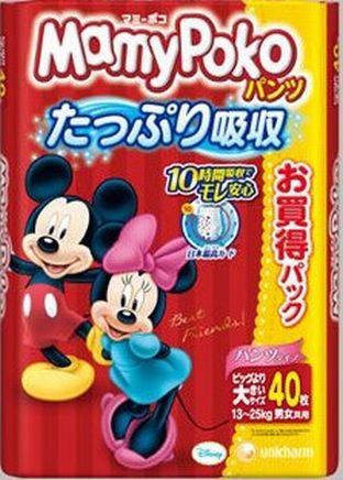 テープタイプと同じように 気軽に使えるパンツ 1.新採用!取り替え時期がひと目で分かる「お知らせサイン」。 2.「2つ折り」形状だから、カンタンにおむつ替えができて体にフィットします。 3.ミッキーのデザインが新しくなりました! 4.たくさんのおしっこでもしっかり吸収できるからモレにも安心です。 5.しっかりついて、何度でもつけ直しできる「ラクラクつけ直しテープ」。 6.おむつの中の湿った空気を外に逃がす「やわらか全面通気性シート」。 7. やさしくフィットしてモラさらない「ウエストのフィットパッド」。 肌にやさしくフィットする「やわらかレッグギャザー」。 ビッグより大きいサイズ40枚 6入り ━━━━━━━━━━━━━━━━━ キーワード:おむつ・オムツ・子供・乳児 ━━━━━━━━━━━━━━━━━