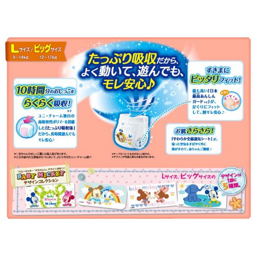 テープタイプと同じように 気軽に使えるパンツ 1.新採用!取り替え時期がひと目で分かる「お知らせサイン」。 2.「2つ折り」形状だから、カンタンにおむつ替えができて体にフィットします。 3.ミッキーのデザインが新しくなりました! 4.たくさんのおしっこでもしっかり吸収できるからモレにも安心です。 5.しっかりついて、何度でもつけ直しできる「ラクラクつけ直しテープ」。 6.おむつの中の湿った空気を外に逃がす「やわらか全面通気性シート」。 7. やさしくフィットしてモラさらない「ウエストのフィットパッド」。 肌にやさしくフィットする「やわらかレッグギャザー」。 Lサイズ64枚 6入りセット ━━━━━━━━━━━━━━━━━ キーワード:おむつ・オムツ・子供・乳児 ━━━━━━━━━━━━━━━━━