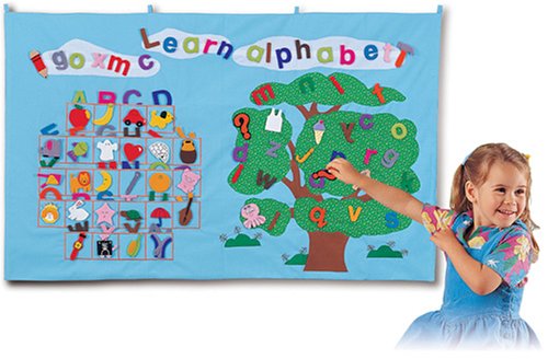 遊びながら五感に刺激を与え、脳の発達を促す布製知育玩具のタペストリー。アルファベットの大文字、小文字の各パーツの裏にはマジックテープがついているので、遊びながらアルファベットの勉強ができるほか、並べて英単語のつづりの練習もできる。世界でも厳しい規格であるヨーロッパ安全基準をクリアしているので、子どもに安心して与えられる。