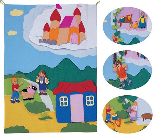 遊びながら五感に刺激を与え、脳の発達を促す布製知育玩具のタペストリー。「ジャックと豆の木」の物語をモチーフにしている。家の扉と雲の上のお城は開閉可能。登場人物と牛、斧、金貨のつぼ、金の琴、ニワトリはそれぞれ着脱可能なので、動かしながら物語を聞かせて楽しむこともできる。草むらの2カ所がポケットになっている。下のポケットに入っている豆のツルを引っ張ると、雲の上まで伸びる。世界でも厳しい規格であるヨーロッパ安全基準をクリアしているので、子どもに安心して与えられる。