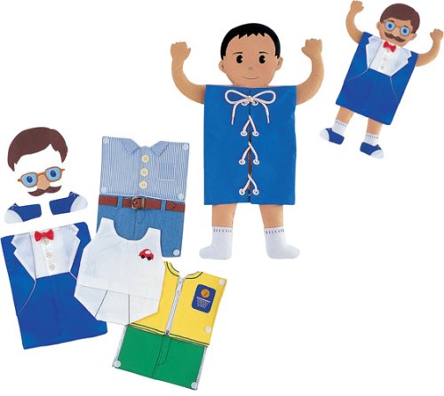 遊びながら五感に刺激を与え、脳の発達を促す布製知育玩具。男の子の着せ替え人形で遊びながら、ひも通し、洋服のボタンかけ、ファスナー、ベルト等の小さな子どもの指先の訓練に役立つ。世界でも厳しい規格であるヨーロッパ安全基準をクリアしているので、子どもに安心して与えられる。女の子の人形もある。