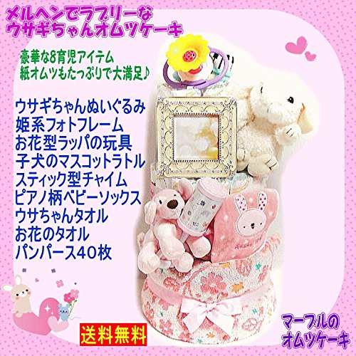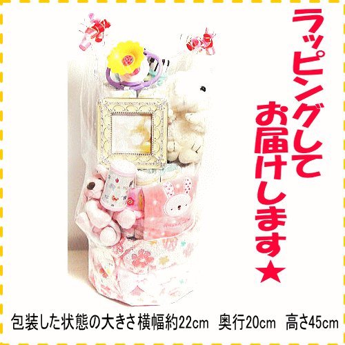 17003 おむつケーキ3段 女の子 姫系ウサギちゃん フォトフレームとベビー玩具 オムツケーキ 出産祝い