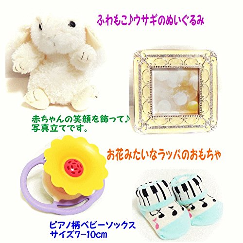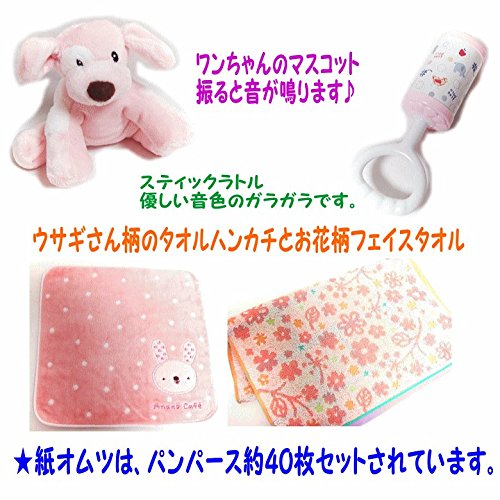 - 【セット内容】ウサギさんのぬいぐるみ、ハンドタオル、フェイスタオル、フォトフレーム、メロディスティック、仔犬のラトル、笛のおもちゃ、ベビーソックス、パンパースSサイズ(生後3-6か月位)約40枚。紙オムツは透明の袋で個別包装して衛生的です。