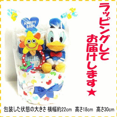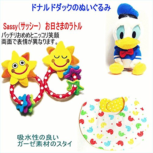- 【セット内容】ドナルドダックのぬいぐるみ、お日様のラトル、ガーゼ素材のスタイ、パンパースSサイズ(生後3-6か月位)約25枚。紙オムツは透明の袋で個別包装して衛生的です。