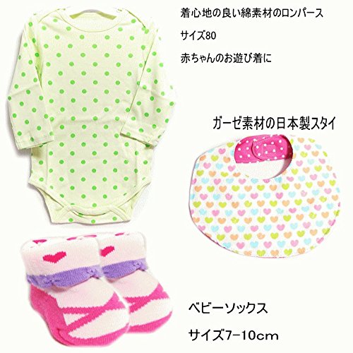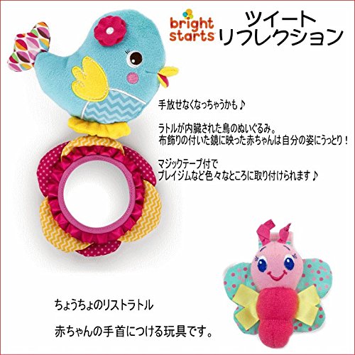 - 【セット内容】ツイートリフレクション・・・・ラトルが内臓された鳥のぬいぐるみ。布飾りの付いた鏡に映った赤ちゃんは自分の姿にうっとり!マジックテープ付でプレイジムなど色々なところに取り付けられます♪ /ちょうちょのラトル・・・赤ちゃんの手首につけるオモチャです。/ロンパース・・・肌触り良い綿素材。ライトグリーンのドット柄です。サイズ80/スタイ・・・カラフルなハート柄。吸水性の良いガーゼ素材、安心の日本製です。/ベビーソックス・・・かわいいピンクのお姫様デザイン。サイズ7-10cm