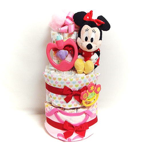 16092 おむつケーキ3段 女の子 ミニーちゃんぬいぐるみとベビー玩具 ベビー服 オムツケーキ ディズニー 出産祝い