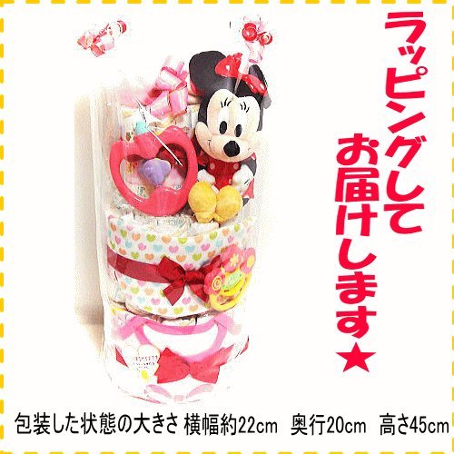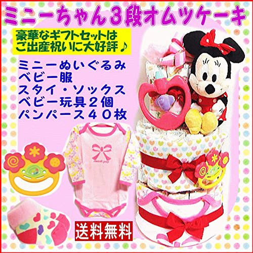 - ディズニーファン必見☆ミニーちゃんの3段オムツケーキです。【セット内容】ミニーちゃんのぬいぐるみ、ガーゼ素材のスタイ、ロンパース(80サイズ)ベビーソックス(サイズ9-12cm)、笛のおもちゃ、お花の歯固め(カミカミして楽しく遊べます)、パンパースSサイズ(生後3-6か月位)約40枚。紙オムツは透明の袋で個別包装して衛生的です。
