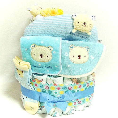 s58 おむつケーキ2段 男の子anano cafe 豪華5点盛り まくら・スタイ・ソックス・ハンカチ・にぎにぎ オムツケーキ 出産祝い