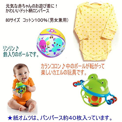- 人気の知育玩具、スタイなど育児アイテム満載。ご出産祝いに喜ばれます。男の子、女の子どちらにも贈れます。【セット内容】知育おもちゃ3点(モンスター、カエルのおもちゃ、ボール)、スタイ、ロンパース(ベビー服、80サイズ)、パンパースSサイズ(生後3-6か月位)約40枚。紙オムツは透明の袋で個別包装して衛生的です。