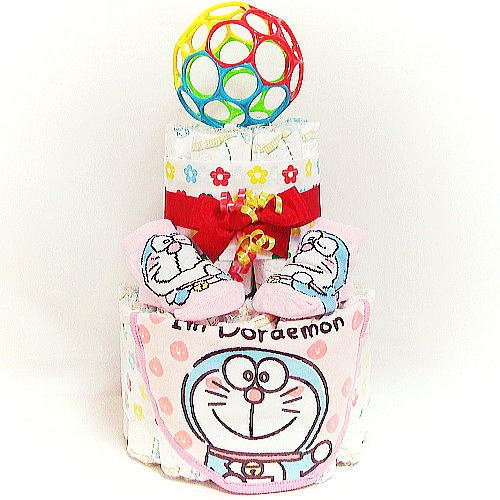 16064 おむつケーキ2段 男女共用 ドラえもん スタイとベビーソックス 楽しいオーボール付き キャラクターオムツケーキ出産祝い