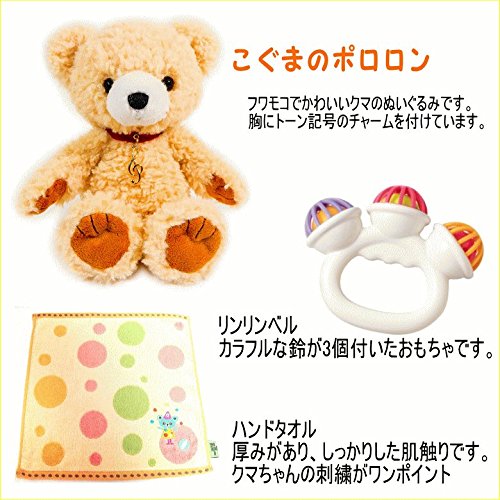 - 男の子、女の子、どちらにも贈れる男女共用のオムツケーキです。【セット内容】テディベアのぬいぐるみ・・・こぐまのポロロン。ふわふわの毛並みです。胸元にトーン記号のチャームを付けています。/リンリンベル・・・鈴が3つ付いたおもちゃです。赤ちゃんは音の出る玩具が大好きです。/ハンドタオル・・・厚みがあり、しっかりした肌触りです。クマの刺繍がワンポイント/パンパースSサイズ(生後3-6か月位)約25枚。紙オムツは透明の袋で個別包装して衛生的です。