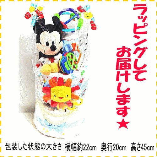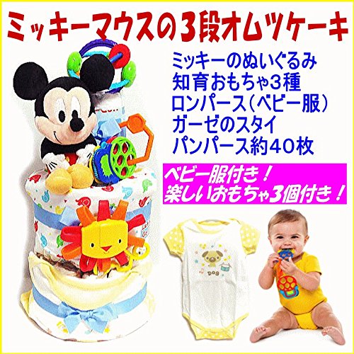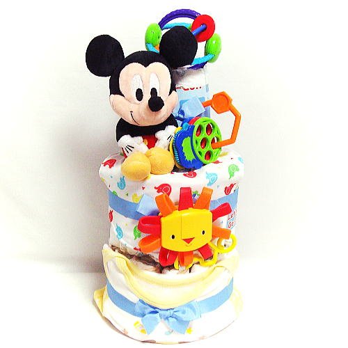 16091 おむつケーキ3段男の子 ミッキーマウスぬいぐるみ・スタイ・ベビー服 知育玩具3点セット オムツケーキ ディズニーキャラクター 出産祝い