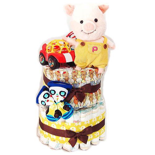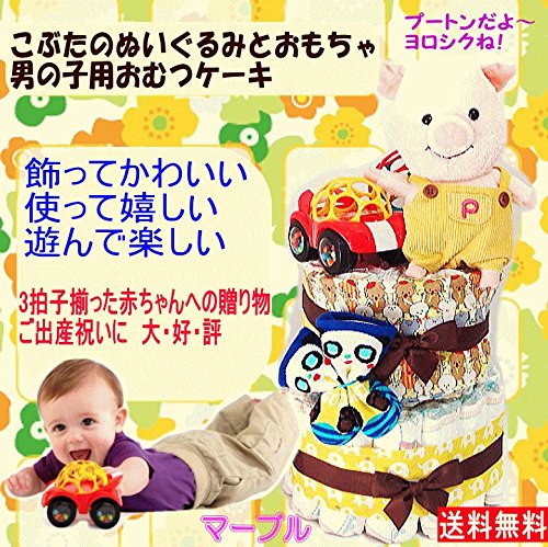 16074 おむつケーキ2段 男の子 こぶたのプートンぬいぐるみと知育おもちゃ オムツケーキ 出産祝い
