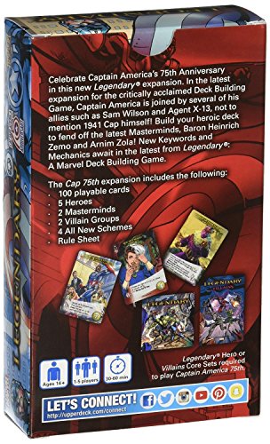 The Legendary: A Marvel Deck Building Game: Captain America 75th small expansion set includes 100 new cards centered around the legendary Captain America, including iconic villains Red Skull and M.O.D.O.K. and allies like Bucky Barnes. The card set featur