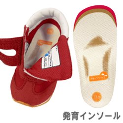 お子様の足の成長を大切に考えたミキハウス×ミズノのコラボレーションベビーシューズ★ ミキハウスのMロゴとミズノのデザインがポイントとなっていてGOOD! 落ち着いた色合いがシックにオシャレに見せてくれます! ミズノのシューズといえば『発育インソール』! ・足の指を使ってしっかり歩ける ・バランスの良い動きが出来る ・足の健康を守って育てる お医者様と一緒に考えた中敷きです。 『3つの足裏アーチサポート』と『ヒールカップ形状』で、はだし感覚で指をしっかり使って歩けるような立体構造の中敷きが特徴です。 また適正なサイズ目安がわかる『つま先サイズフィッティングカラー』がついています。 中敷きを取り出し、お子さまの足をのせてチェックしてくださいね。 かかと部分にはリフレクター(反射テープ)がついて安全面にも考慮しています。 優れたデザインと機能性がコラボした最高のシューズです★ こちらのシューズは適度な硬度と衝撃吸収性を持たせ、足なりにフィットする構造をなっているため、甲高設計の他の定番ベビーシューズより、履き心地の感覚が異なります。 (ぴったりフィットするため、圧迫感があり窮屈に感じられるお子様もいらっしゃいます)