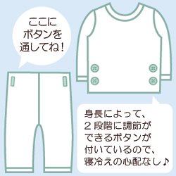 発送方法は、クロネコDM便でお送りします。※必ず、注意事項をご確認の上、お求め下さい。 お子さまの大好きな働く車がいっぱい♪総柄プリントパジャマです☆ 前開きで着脱しやすく、スナップボタンで開閉できますよ。 80cmから110cmまでは、上衣とパンツを留められる調節可能のボタンが付いています。 これで寝ていてもお腹がでちゃう心配ナシ◎ お生地は通常のTシャツ素材なので、お洗濯もしやすいですよ! しかもお値段がリーズナブルなところも魅力的ですね♪ お子さまの興味を引くモチーフと一緒に楽しい夢を見てね☆ ★上衣とパンツを留めるボタン付き