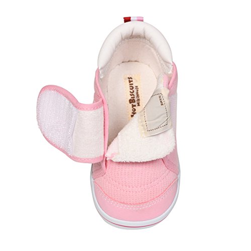 飛んだり走ったり、しっかりとした歩行ができるようになったら、 選んであげて欲しいセカンドベビーシューズです。 素材は細かなワッフル地のようなタックピケを使用。 面ファスナーで甲ベルトが開いて、履かせやすくなっています。 他にも赤ちゃんの歩行をサポートする機能が充実していますよ。 甲ベルトには「HOT BISCUITS」のカラフルなブランドタグ付き。 かかとにはビーンズくんとキャビットちゃんのポイント刺繍入りです。 赤ちゃんの成長は早いもの。 3ヶ月程度を目安にこまめに足のサイズを測ることを心がけ 常に最適なサイズの靴を選んであげてくださいね。 ギフトにもオススメです。 ※面ファスナーとは、マジックテープのことです。(「マジックテープ」は(株)クラレの登録商標です。) ●セカンドシューズ仕様 ●フレックスソール ●2Eラスト設計 ●しっかりカウンター