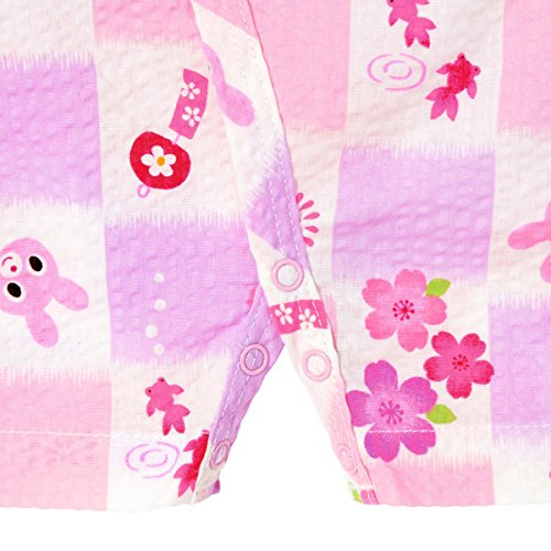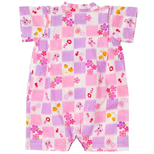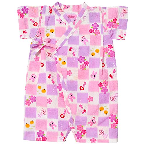 白地に桜模様と市松柄が爽やかな甚平オールです! 夏の風物詩とキャビットちゃんのお顔がプリントされていて、ホットビならではの可愛さ! 部分的に収縮させているリップル素材は、シワも気にならず肌触りも涼しげ! 夏らしいポコポコした素材感が肌に密着せず、通気性にも優れているので、 お部屋着やお風呂あがりにも、さらっと気持ちよく着られます。 股部分はホックボタンで開くので、オムツ替えもささっと楽に出来ますよ。 ショートオールのように上下がつなぎになっているから、1枚着せるだけでママもらくちん! 抱っこやハイハイでも、お腹が出る心配がありませんね! 花火大会や夕涼み…夏のイベントデビューに大活躍して下さいね!
