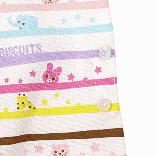 可愛らしいホットビキャラクターがプリントされた 夏向き素材の半袖パジャマです! 手描き風のボーダーから、キャラクターたちが顔を出していてユニーク! サイドには上衣とパンツを留められる調節用のボタン付き。 これで寝ていてもお腹がでちゃう心配ナシですね! お生地はさらっとした細かな織り柄のワッフル素材で着心地も! これを着て寝ると、可愛いキャビットちゃんやアニマルたちと 一緒に楽しくお出かけの夢がみられるかな! ●パンツ:6分丈 ●80cm・90cm 肩あき ●上衣とパンツを留めるボタン付き:80-110cm