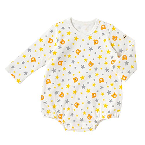 総柄プリントが可愛らしい長袖ボディシャツです。星柄とスニーカー柄にビーンズくんのお顔プリントがとってもキュート!!えり元は肩あきのかぶりタイプなので、お着替えもしやすい。股下は3つのホックボタンでとめられるので、おむつ替えもラクチンです!長袖肌着にすると、薄着でもあたたかく過ごせますね。可愛らしいインナーとして、お腹まで覆えるので活発に動いても安心。用途に応じて使い回しが効くボディシャツは、便利でオススメですよ!! ●素材:40/2天竺プリント●品質:綿100%(リブ部分)綿64%、ポリエステル36%●生産国:中国