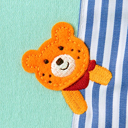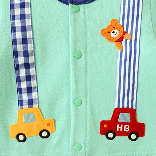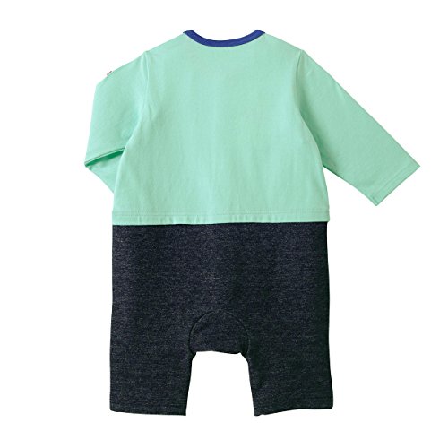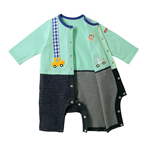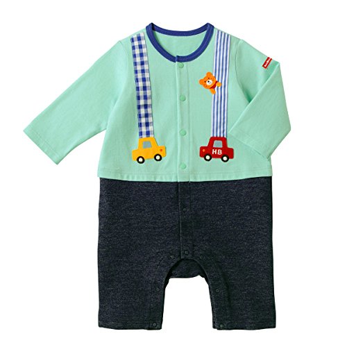 セパレート風にアレンジされたサスペンダー風カバーオールです。 左右がチェックとストライプになったサスペンダーに 色違いの車のワッペンが可愛くてインパクトありますね! さりげないビーンズくんのミニワッペンも効いてます! トップス部分は天竺素材で、爽やかな色合いが素敵ですね。 前開きホックボタンで足元まで全開出来て、お着替えやオムツ換えもラクチンです。 ボトムス部分はストレッチニットデニムで動きやすく 股下は7分丈なので、足さばきも軽やかでベビーちゃんもゴキゲン! たくさんの重ね着が難しい赤ちゃん時期にぴったりの1枚です。 ご出産のギフトにしても喜ばれそうですね! ●股下7分丈