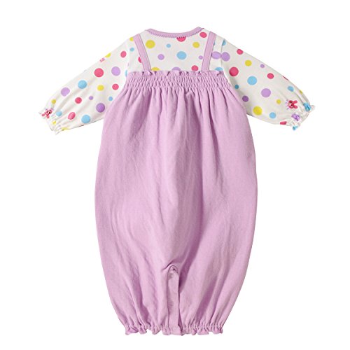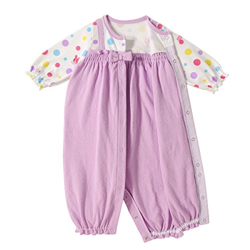 オールインワンの重ね着風ツーウェイオールです! トップス部分は天竺素材、ボトムスは接結天竺。 ツーウェイオールは股下ホックの付け替えで、 発育に合わせて2通りに使えて重宝する優秀アイテム! 新生児期はおむつ替えに便利なドレスタイプに、 足の動きが活発になってきたら、カバーオールタイプとして着用いただけます。 ビーンズくんのお顔はワッペン。 ボーダーTシャツとのカジュアルな重ね着風が可愛い! キャビットちゃんはトップス部分に ポップな水玉と一緒にプリントされています。 オールインワンの淡いパープルがオシャレですね! 前開きホックボタンで足元まで全開出来て、 お着替えやオムツ換えもラクチン! たくさんの重ね着が難しい赤ちゃん時期に最適。 ご出産の御祝にもピッタリです! ●素材:(プリント部分)(紺)20/2天竺プリント(パープル)40/2天竺プリント(無地部分)接結天竺 ●品質:綿100%(リブ部分)綿72%、ポリエステル28% ●生産国:日本