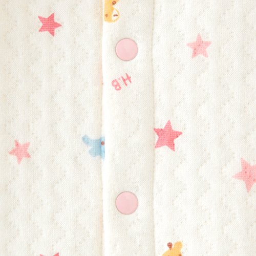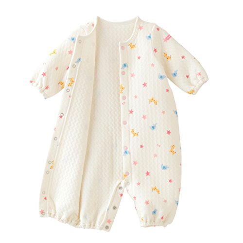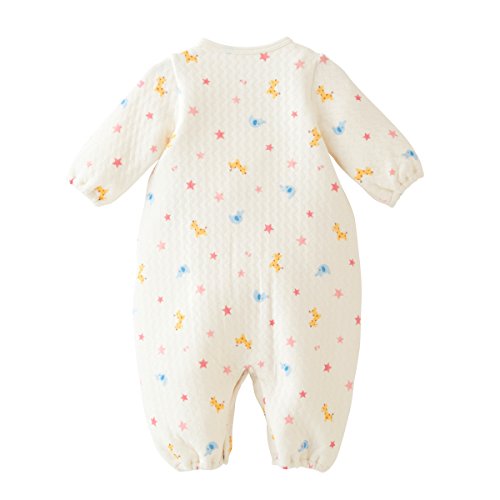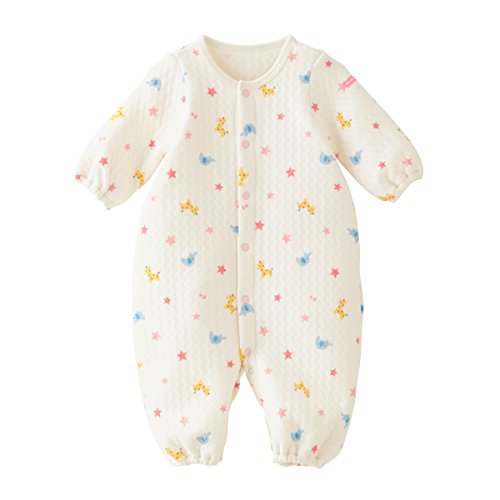 ゾウさんとキリンさんと星柄がプリントされた ニットキルトの可愛らしいツーウェイオールです。 波型に縫製されたキルト模様がオシャレですね♪ やわらかな肌触りで、あたたかくベビーちゃんを包みます。 ツーウェイオールは股下ホックの付け替えで、 発育に合わせて2通りに使えて重宝する優秀アイテム☆ 新生児期はおむつ替えに便利なドレスタイプに、 足の動きが活発になってきたら、カバーオールタイプとして着用いただけます。 前開きホックボタンで全開しますので、お着替えも簡単☆ 股下ホックボタンで、オムツ替えもラクチンです♪ 清潔感のある白を基調としたデザインは、ベビーちゃんにピッタリ♪ ご出産準備の基本アイテムとして、準備しておくといいですね☆ ニットキルト素材は、やや弾力のある厚みで冬アイテムに最適!! 生まれてすぐ着られるご出産御祝のギフトにもどうぞ♪