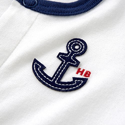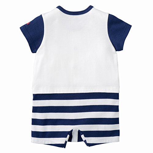胸元のイカリマークがポイントのセパレート風ショートオールです 白を基調としたマリンボーダーのデザインが爽やかですね 前ホックで股下まで全開するので、オムツ替えやお着替えもラクチン 羽織り物やレッグウォーマーをプラスすれば、長い期間着まわせますよ 重ね着が難しい赤ちゃん時期でも、コーディネートいらずで1枚で着られて お着替えさせるのもラクチンなのが、ママも嬉しいですね ベビーちゃんらしさが抜けて、ちょっとお兄ちゃんっぽくなりますね お袖、裾が短くて涼しく過ごせるショートオールは、ベビーちゃんの夏必須アイテム!! 夏のお出かけや、ギフトにもオススメです