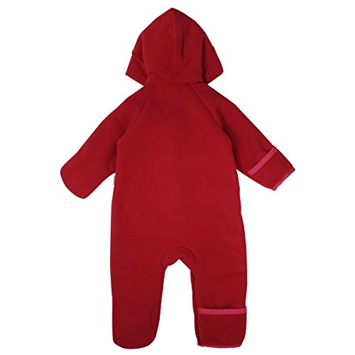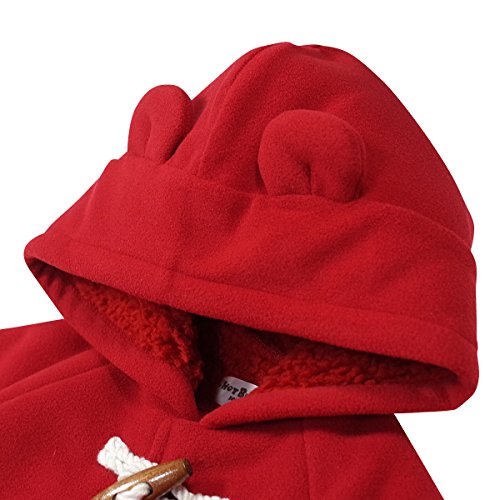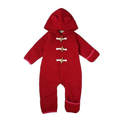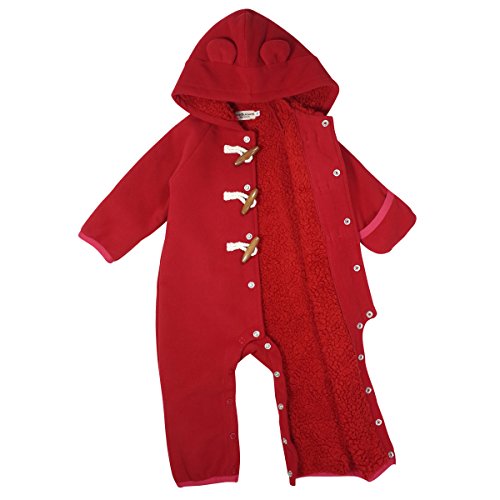 フリース素材のシンプルで可愛いジャンプスーツです。 ご好評いただいたダッフルシリーズでジャンプスーツをつくりました。 ベビーちゃんのトラッドスタイルは珍しくなかなか貴重ですね。 フードにはお耳がついて、なんとも可愛らしいデザインになっています。 裏にふわふわのフリースをボンディング(接着)して素材が一体化しているので かさばらずすっきり着られて、なお且つあったかいですよ。 前は木製のトグルボタンと、その下にホックボタンが付いています。 股下までホックボタンが付いて全開しますので、お着替えやおむつ替えも簡単。 袖口と足先をくるっと折り返すと、手足を隠せてあたたかさをキープ。 ベビーカーでもあたたかく赤ちゃんを包み込みますよ。 寒い日のおでかけも、このジャンプスーツで安心ですね。 ちょっと豪華なご出産のギフトとしてもおすすめです。