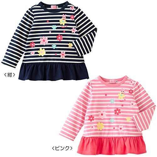 ボーダー柄にお花のプリントが入ったキュートな長袖Tシャツです。 お花と一緒のさりげないキャビットちゃんは、ポイント刺しゅうになっています。 ボーダーに合わせたお花プリントは、華やかでオシャレ度もアップ!! 定番のボーダーアイテムにプラスされた小技が効いてます☆ 裾はフリル仕立てでとってもガーリー♪ この1枚で女の子らしいスタイルを楽しんでくださいね☆ ●80cm・90cm 肩あき