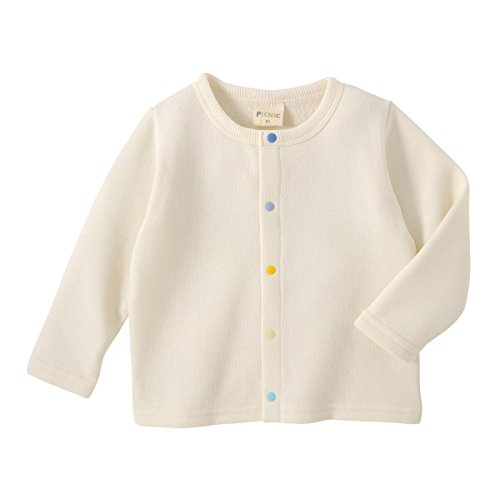 クルーネックの裏毛カーディガン。カラフルなスナップボタンがアクセントになってかわいいです。