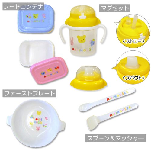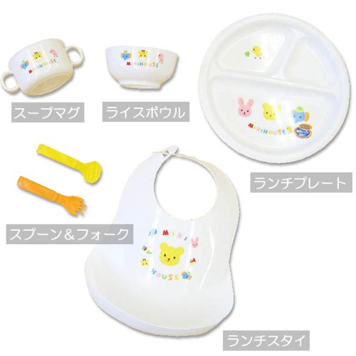 くまやきりん、ひよこにぞうさん♪ かわいいどうぶつたちの にぎやかでカラフルな柄がミキハウスらしい テーブルウェアセット!! こんなかわいいお食事セットなら、好き嫌いなく 何でも楽しく食べられそうですね♪ <ステップ1> 5・6ヶ月頃~まだ自分では食べられない赤ちゃんに、 フィーディングスプーンとマッシャーでお口に運んであげましょう♪ 離乳食を入れるファーストプレートと、 冷蔵庫に保存したり、ちょっとお出かけに持ち運べるパッケージが2つ付いています。 [マグセット] 5ヶ月頃~使用のスパウト口と、 8ヶ月頃~はストロー口に取り替えてお使いいただけます。 <ステップ2> 12ヶ月頃~固形のおかずを食べられるようになってきたら ランチプレートに栄養バランスよく盛り付けましょう♪ ランチスタイを付けて、自分で食べる練習を始めましょう☆ 食器類はすべて電子レンジ使用可能です。 かわいいボックスに入ってこれだけそろってこのお値段はかなりお得!! ご出産お祝いとしてぴったりですよ! 全て食器洗い乾燥機のご使用は可能です! (以上6点は電子レンジ使用可) (以上5点は電子レンジ使用不可) ■素材 (ランチスタイ)ポリエチレン (その他の本体)ポリプロピレン ■取り扱い ※マッシャーついて マッシャーは食べ物を押し潰す際にご使用いただくものです。 すり鉢や網目状の上でのご使用は、表面の磨り減りの原因となりますのでお避けください。 ■生産国 日本