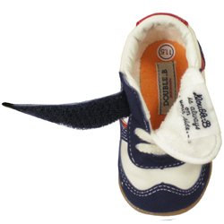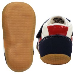 マジックテープで大きく開閉するので履かせやすく、内側はパイル素材で肌あたりも優しいですね。 靴紐部分はゴムを使用しているので、履く時に伸ばせて便利です。 ほどける心配もありません。 靴裏は凹凸があるポコポコしたゴム底で滑り止め効果があり、スムーズな歩行を助けます。 赤ちゃんの成長は早いもの。 3ヶ月程度を目安にこまめに足のサイズを測ることを心がけ、常に最適なサイズの靴を選んであげてくださいね。