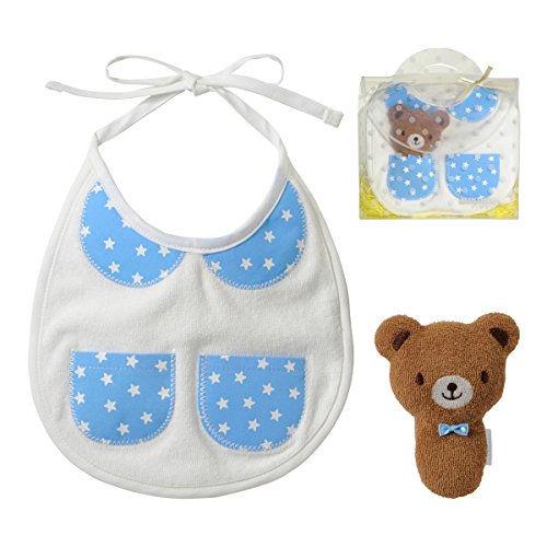 まるで、おとぎ話にでてきそうなミニポケット付きの丸襟風の刺繍がついたスタイと 赤ちゃんの初めてのおもちゃにぴったりなカワイイどうぶつラトル♪