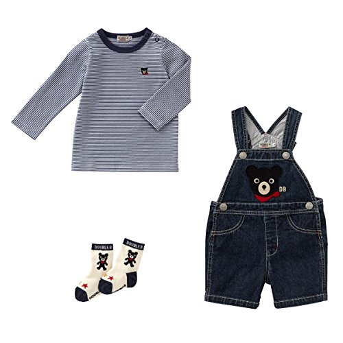 ●セット内容:オーバーオール+Tシャツ+ソックス+ギフトボックスL●パンツ5分丈●Tシャツ肩あき●ソックス11-13cm付き●素材:[オーバーオール]8オンスデニム,(背あて・肩紐裏)ヒッコリー[Tシャツ]40/2天竺ボーダー●品質:[オーバーオール]綿100%[Tシャツ]綿100%,(リブ部分)綿73%、ポリエステル27%[ソックス]綿、ナイロン、ポリウレタン●生産国:オーバーオール]ベトナム[Tシャツ]中国[ソックス]日本