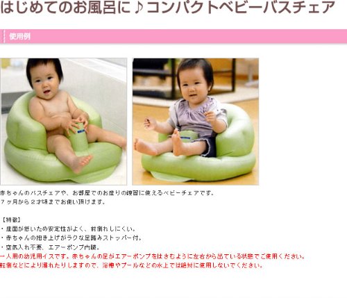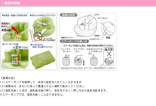 赤ちゃんのバスチェアや、お部屋でのお座りの練習に使えるベビーチェアです。 7ヶ月から2才頃までお使い頂けます。 【特徴】 ・座面が低いため安定性がよく、前倒れしにくい。 ・赤ちゃんの抱き上げがラクな足踏みストッパー付。 ・空気入れ不要、エアーポンプ内臓。 一人用の幼児用イスです。赤ちゃんの足がエアーポンプをはさむように左右から出ている状態でご使用ください。 転倒などにより溺れたりしますので、浴槽やプールなどの水上では絶対に使用しないでください。 【使用方法】 (1)エアーポンプを使用して、本体に空気を入れてふくらませます。 (2)使用後は、きれいに洗って風通しのよい場所で乾かしてください。 (3)空気を抜くときは、空気栓を指で押し、本体をやさしく押しながら空気を抜きます。 ※エアーポンプでは、空気を抜くことはできません。