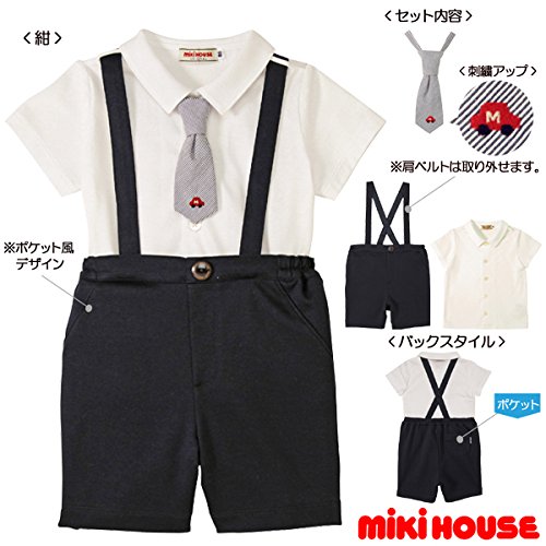 男の子用のフォーマルセットです☆シャツと5分丈パンツとネクタイの三点セットで、このお値段はお値打ち◎5分丈パンツはストレッチが効いているので、お子様もとっても履きやすいですよ。肩ベルトはボタンで取り外し可能になっています。前ボタンには「MIKIHOUSE」の刻印入り。後ろポケットがひとつ付いて、前ポケットは飾りになっています。ネクタイはシャツのえりの下で、ホックで止めるタイプなので取り付けも簡単♪オシャレなストライプ柄に「M」のイニシャルが入った赤い車の刺繍がポイントです☆シャツの肩部分には、ハーフパンツの肩ベルトが落ちてこないようにベルト通しが付いています。しかも嬉しい日本製◎キチンと感があっても着心地のいい素材なら、窮屈にならずにお子さまもゴキゲン♪結婚式などあらたまったお席にお招きされても、このコーディネートでバッチリですね☆★パンツ:5分丈