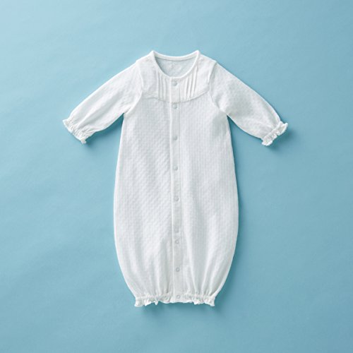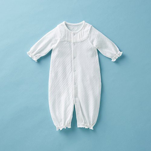 股下のスナップボタンの付け替えで、新生児期はベビードレスとして、また足の動きが活発になってきたらカバーオールとして普段着にお使いいただけます。