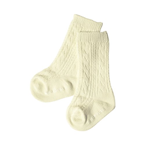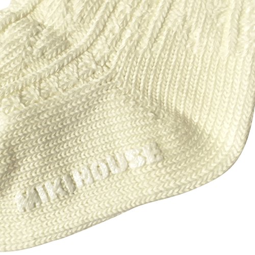 ケーブル編み模様のハイソックスです☆ちょっぴりお兄さんお姉さん風でおしゃれな足元を演出しますよ♪白は男の子女の子どちらもOK☆秋冬のベビーちゃんの足元にハイソックスは必須アイテム!シンプルでコーディネートを選ばない上質なくつ下は、1足あるととても助かりますよ♪足裏のmikihouseのロゴは、簡易滑り止めになっています。