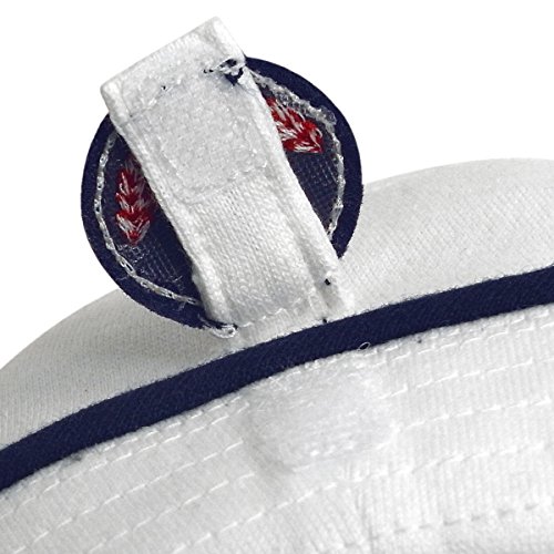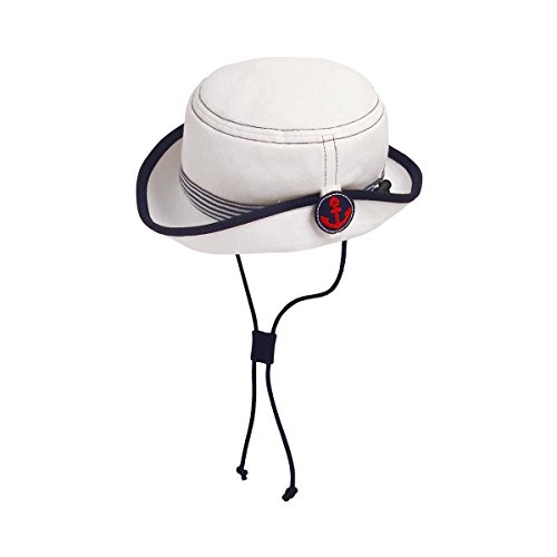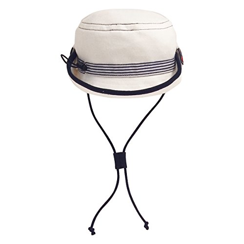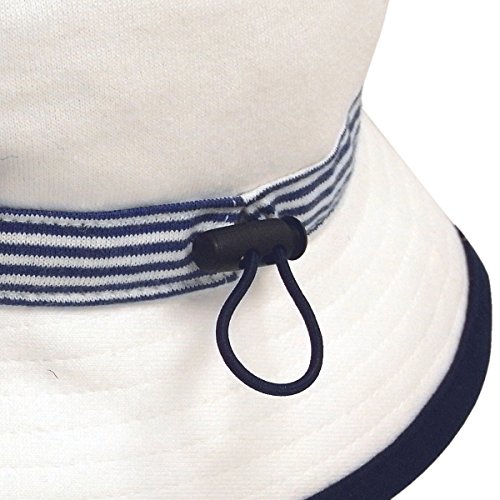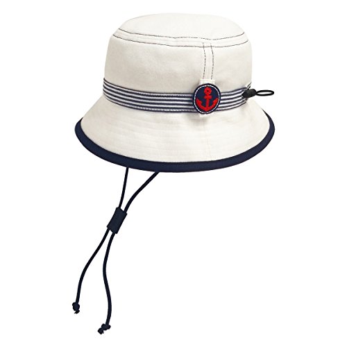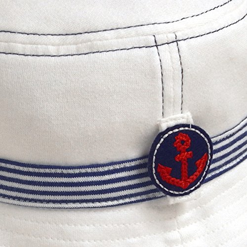 マリン風のイカリマークがポイントの帽子です☆両サイドに付いたイカリマークの刺繍ワッペンには、面テープ(マジックテープ)が付いているので、つばの両サイドを留めるとテンガロン型が完成!!長めのあご紐がカウボーイ風で、ベビーちゃんながらも、カッコ可愛い雰囲気を演出してくれますよ。頭囲はドローコード(ひも通しが付いた調節機能)で調節できます。やわらかな素材でかぶりやすく、UVカットも備わって機能性にも優れています。お子様の頭を紫外線からしっかり守ってあげましょう!
